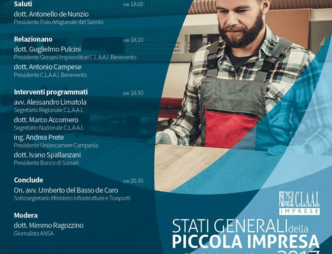 sarei lieto della Tua presenza agli Stati Generali della Piccola Impresa 2017,​evento organizzato​dalla CLAAI di Benevento, e che si terrà lunedì 17 luglio dalle ore 18.00, presso il Polo Artigianale del Sannio (Per indicazioni stradali clicca qui). Un programma ricco d’interventi (nell’invito digitale in seguito) – con protagonisti della vita lavorativa, associativa, finanziaria e politica, di rilievo locale, regionale e nazionale – sarà occasione di discussione per le nuove strategie di sviluppo che dovranno investire sullo sviluppo di quelle piccole imprese e attività artigianali, vere portatrici del marchio Made in Italy in Europa e nel mondo.