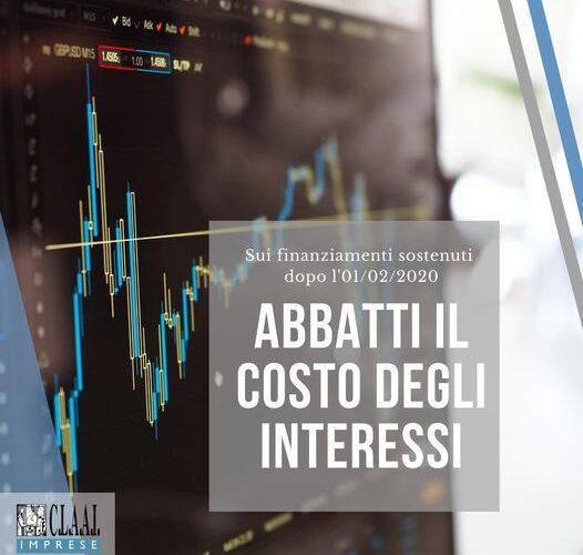 Il contributo consiste in un sostegno economico a fondo perduto, per un massimo di €2.500, erogato in un’unica soluzione, finalizzato all’abbattimento del costo per interessi sia per i finanziamenti concessi dalle banche, o da altri intermediari finanziari autorizzati, stipulati a partire dal 1 febbraio 2020 finalizzati a: